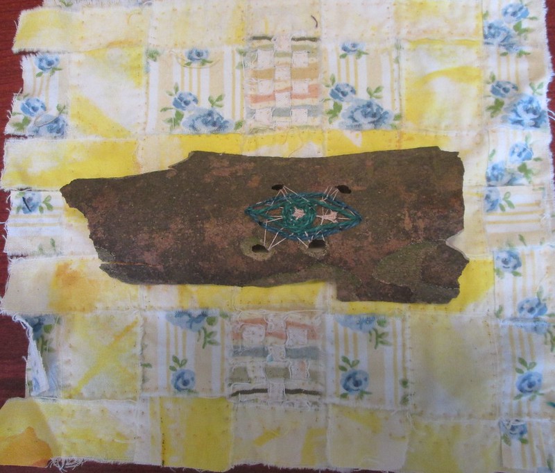 She asked us to consider different things that can be used as looms. I admired another artist, Linda, who posted photos of her birch bark weavings. On my way to work yesterday I found a piece of sycamore bark with three small holes in it. I carefully cut out another hole to match and poked a few needle holes and started playing with it. Oh, it was such a big old messy spider web of silk thread. Then it wanted to be an eye, so I let it.