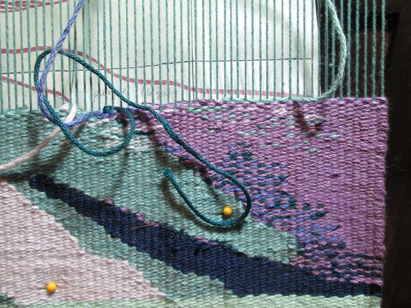 I’ve gotten about another inch done on the tapestry. The lower part will have more blocks of solid color, but as I get higher, there will be more color mixing such as in this detail: