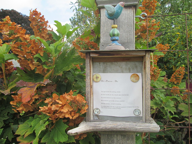 She took me to a house where I rented a room via AirBnB – a first for me. It was comfortable and clean, and I amused myself early in the morning by returning their escaped chickens to their fenced back yard and walking around a cute neighborhood. The poem above was posted in front of a creative front yard across the street, and it was so spot on for my journey here and beyond that I’ve decided to use it. I don’t know the poet’s name. I googled the words and received no results. M, who lives on N. Arlington St. in Portland, I am grateful for your beautiful words. Here they are, since they are hard to read in the photo.