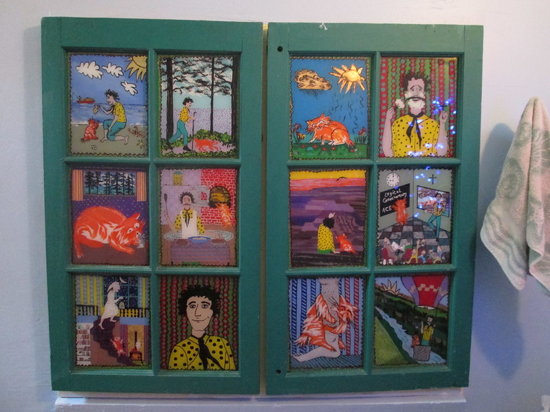 Let me say it right up front – Pam Patrie is an AMAZING hostess, and her cabin on a cliff overlooking the Pacific oozed charm and personality and comfort. Here is the front of her medicine cabinet in the bathroom!