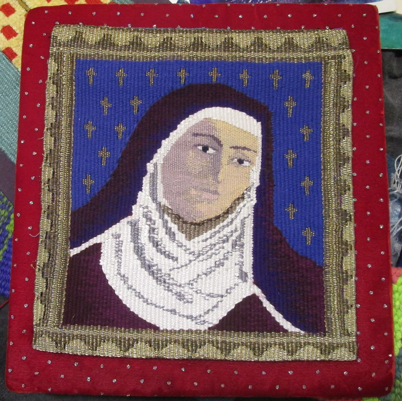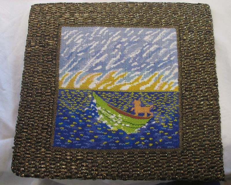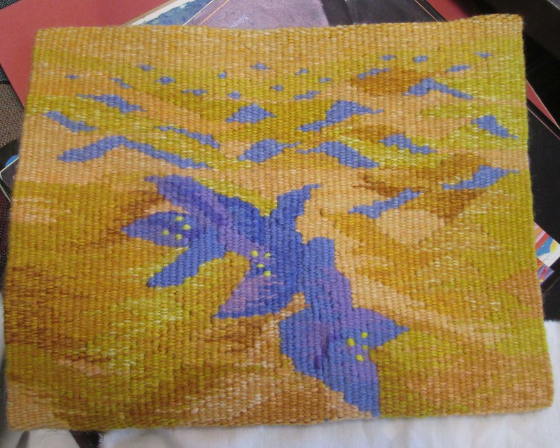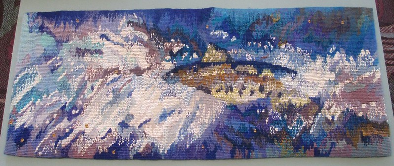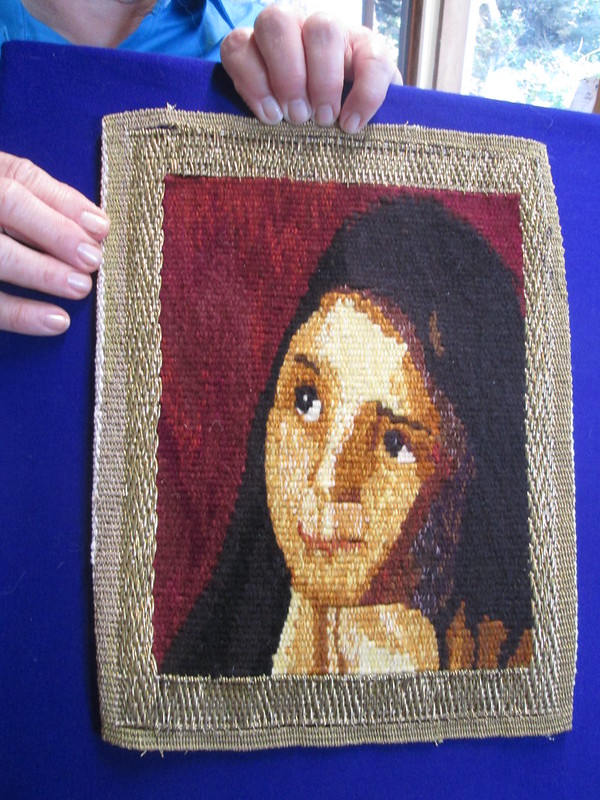 The rest of the day was devoted to weaving our tiny sample tapestries and Pam discussing her work. She showed us many of her samples for her large commissions and smaller pieces in a series of personal work she is doing. She had asked us to write down what kind of boat we would choose to be. We drew her pictures too. The photos below are of Pam Patrie’s work. You can see the larger tapestries on her website. Wow, her samples are bigger than most of my tapestries.
