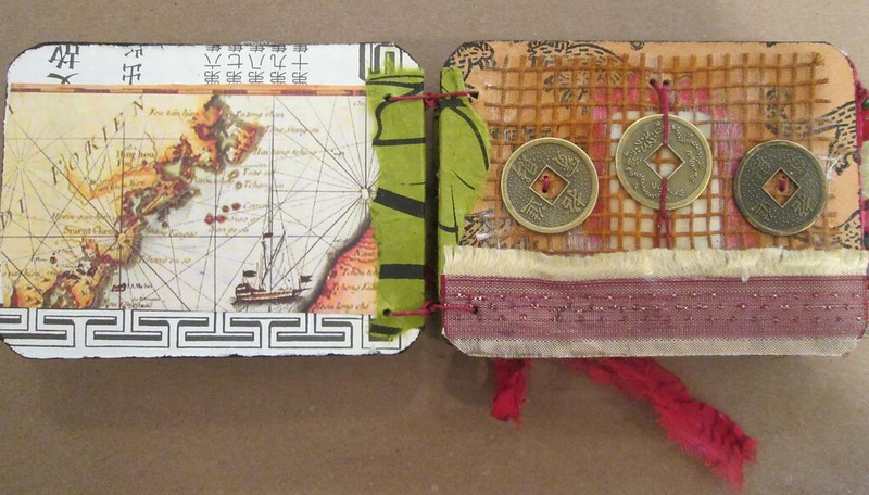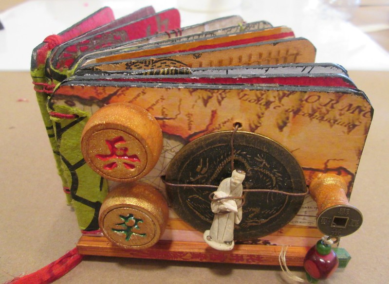 As with the other class, I was so completely engrossed in Sharon Payne Bolton’s Far East class that I didn’t get many process photos. However, I took a lot of photos of her books and my classmates’ books for inspiration and they are on my Flickr page. The photo above is of the front cover of my book. Here are a couple of shots of the spreads in it: