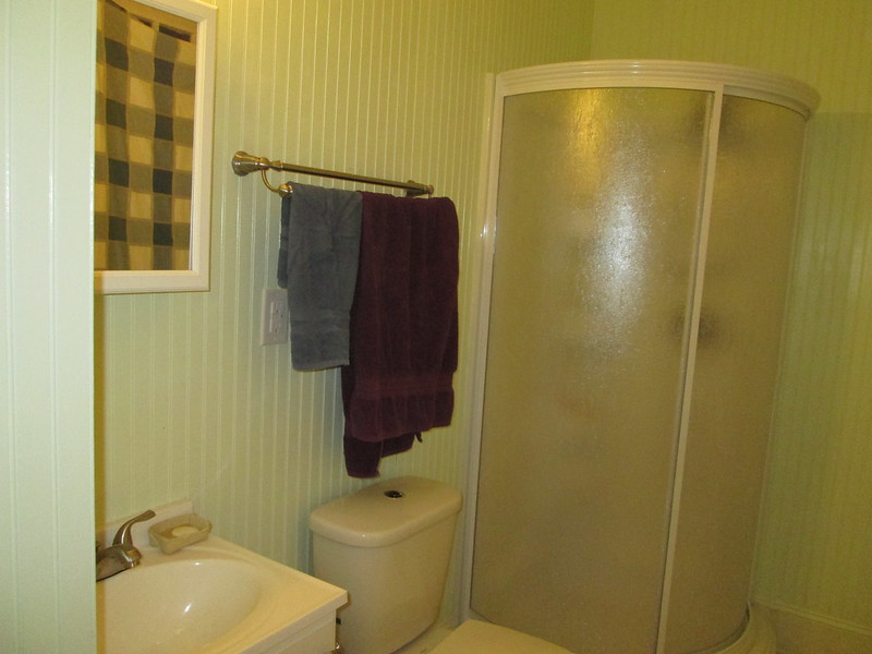 Here’s a photo of our new bathroom. It was hard to photograph because of the long shape. There are two windows and I’m planning to finish painting the trim this weekend. We still need to put up window treatments too. Right now I have an Indian batik bedsheet on one window and a thrift shop single curtain on the other.