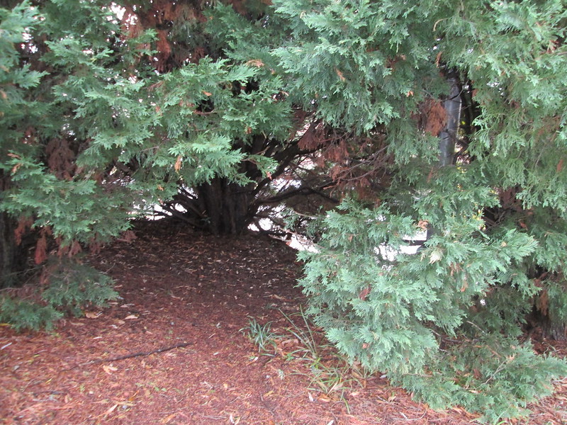 I walk by a day care center on my way to work. Nearly every day at 5:00 some munchkins burst out of the gate and head for this little “room” under these cedars. At that age I would have wanted to live there.