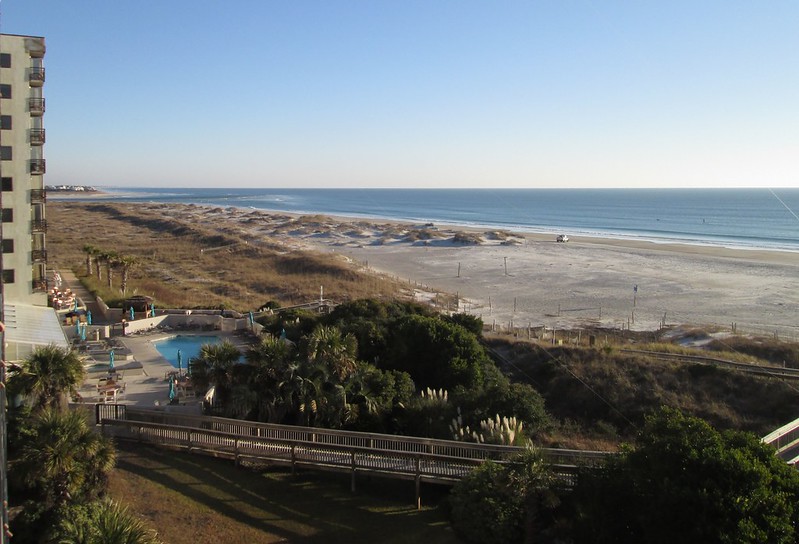 Then Sandy and I stayed overnight at Shell Island Resort at the end of Wrightsville Beach. It’s showing its age a bit but it was nice to have an oceanfront room for about the same price as staying in town. I got 6000 miles for staying there too – paying for 1/4 of my next flight to Portland, so woo-hoo for that! I walked on the beach the next morning. Chilly, but pretty.