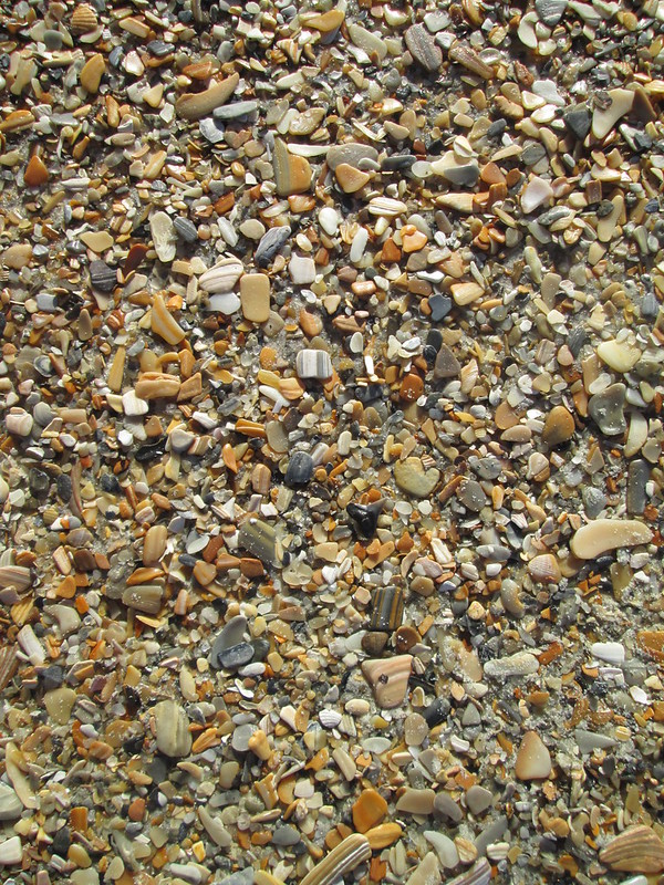 I thought about the difference in the West Coast beaches I’ve fallen in love with and these Carolina beaches I’ve grown up with. On the west coast, there are big boulders and mountains and cliffs and sea creatures on those rocks that make me look up and around and draw me in to explore the nooks and crannies. On our sandy beaches, my eyes are always looking down because there are so many cool shells and stones to gather. I’m not one of those people looking for perfect shells. I look for interesting textures and shapes, so the old worn-out pieces of conch shells with holes from starfish and barnacles and other sealife are my favorites. My friend Missy taught me some tricks for finding shark’s teeth. I did find one – can you spot it?