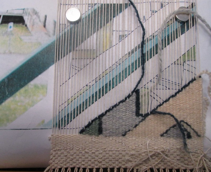 Playing with fine lines in wee urban landscape tapestry on my little frame loom. This one is 4.5 x 4.5 inches and is designed from a photo that I took out of a classroom window at Fort Worden in Port Townsend, Washington. There was a wooden staircase next to the window and sidewalks and a parking lot beyond. I like to have a project in progress that is portable.