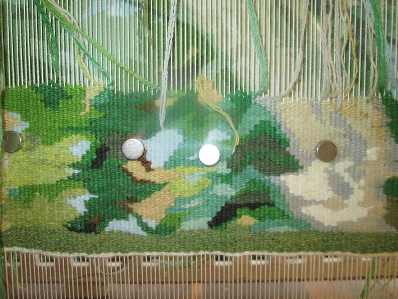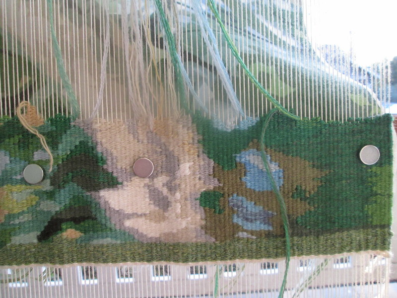 I weave on the front porch as much as possible to take advantage of the natural light and the pleasant weather now. Here’s the progress on “Hammock View.”