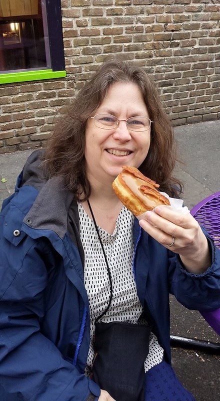 At 6 a.m. I was on the train downtown with Voodoo Doughnuts as my chosen destination. I had just enough time to have a maple bacon doughnut, a cup of coffee, and to take the train back to meet Jeanne for my ride to Cannon Beach on Thursday morning.