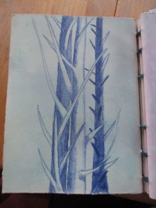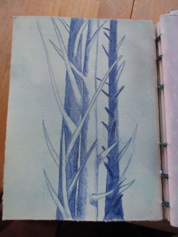 On Friday morning I got up to find Jeanne sitting at the table drawing with watercolor pencils and the other women gone downhill to walk on the beach. Jeanne offered her pencils for me to try them and I ended up, quite unintentionally, with my tapestry design for the retreat. I am fascinated with the trees on the cliffs.