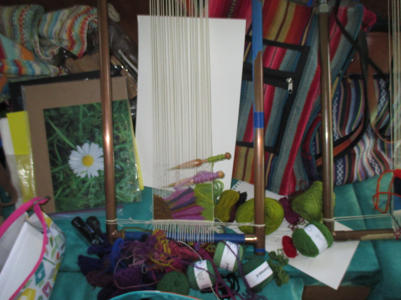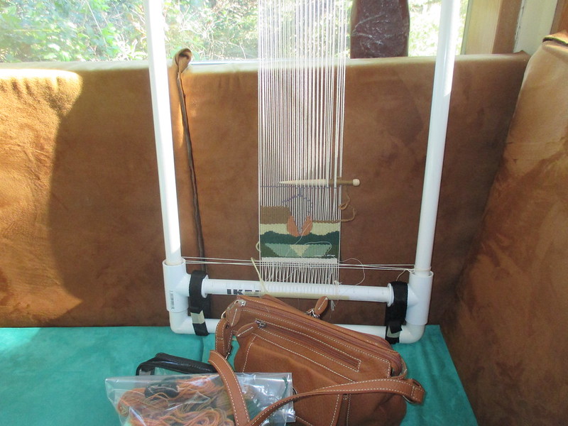 Susan and Archie set up one of their pipe looms to demonstrate on. This makes me want to build one (or buy one). You can get the plans for free or buy one from their website. It would be nice to have a loom this size that is portable and affordable. I like that it can be propped against a wall. The next day Archie demonstrated tying leases on this loom. After watching him, I understood how useful those extensions off the top of the loom are.