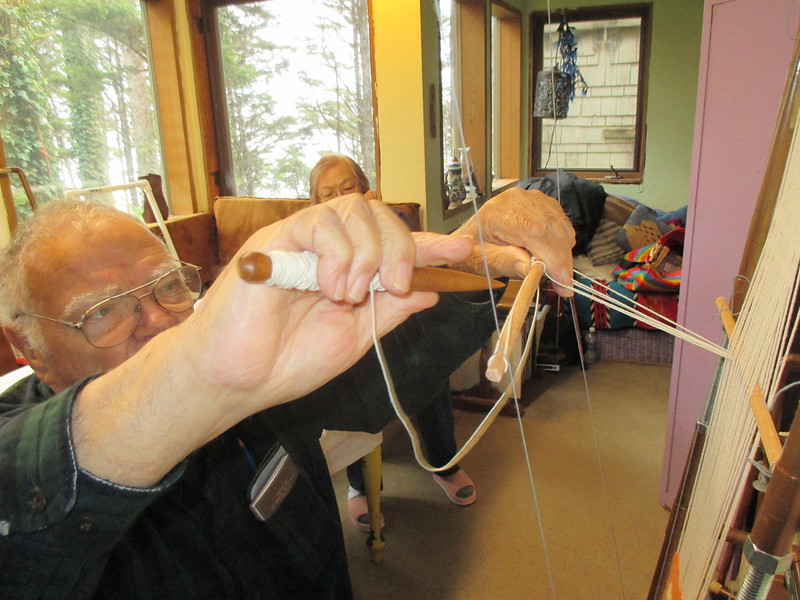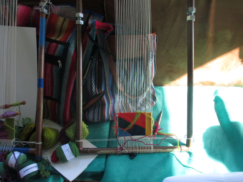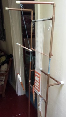 Susan and Archie set up one of their pipe looms to demonstrate on. This makes me want to build one (or buy one). You can get the plans for free or buy one from their website. It would be nice to have a loom this size that is portable and affordable. I like that it can be propped against a wall. The next day Archie demonstrated tying leases on this loom. After watching him, I understood how useful those extensions off the top of the loom are.