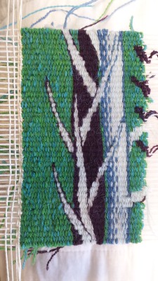 By the end of the second day, April 25, this is what my tree tapestry looked like, turned on its side to show its correct orientation when displayed. I learned how to make a horizontal line between blocks of color smoother by using a split pass. We all concentrated on our own little tapestries, and divided ourselves into the hot-natured group who opened the windows of the room we were in, and the cold-natured group had the heat turned up in the other room. What I found interesting is that I was the only one from the South but I kept having to go outside and wipe off the sweat, while the Canadians were shivering in their coats. We worked it out. Honestly, you cannot make a group of women who are middle-aged and older satisfied about the temperature.