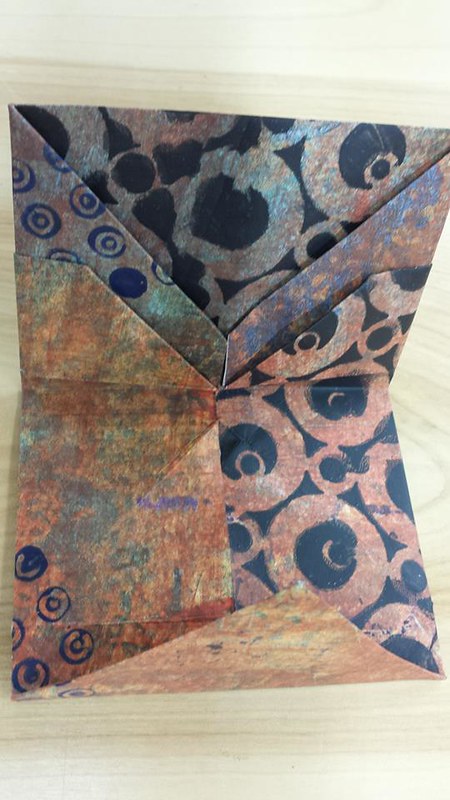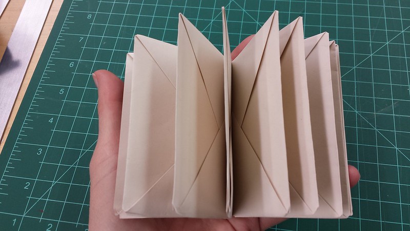 I really liked the blizzard book. It takes a very long piece of paper, and there is a lot of room to play with this one. All folded. The cover (second photo) drove me a bit crazy, but it would be worth practicing. I took a photo to help me remember what the creases and folds should look like.