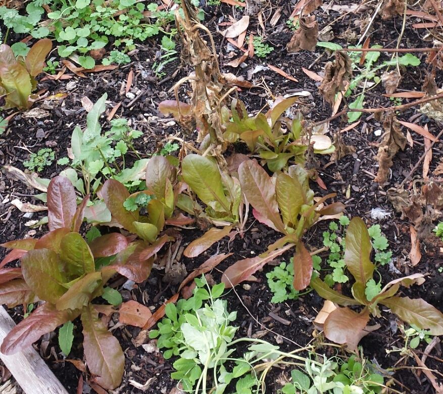 When I went to my community plot my plan was to clean it all out and email the leaders that I was giving it up. However, when I got there I had a nice patch of rouge d'hiver lettuce. I didn't expect that because two months ago I gave up on the lettuce and peas when some critter was obviously chowing down on them, but I did get a lot of butterbeans from a very few bush plants (Henderson bush was the variety). That cheered me up and I picked what green cotton was there, transplanted some of the lettuce plants to a barrel at home, and picked some nice clean chickweed to go with the lettuce for a tender fresh salad.