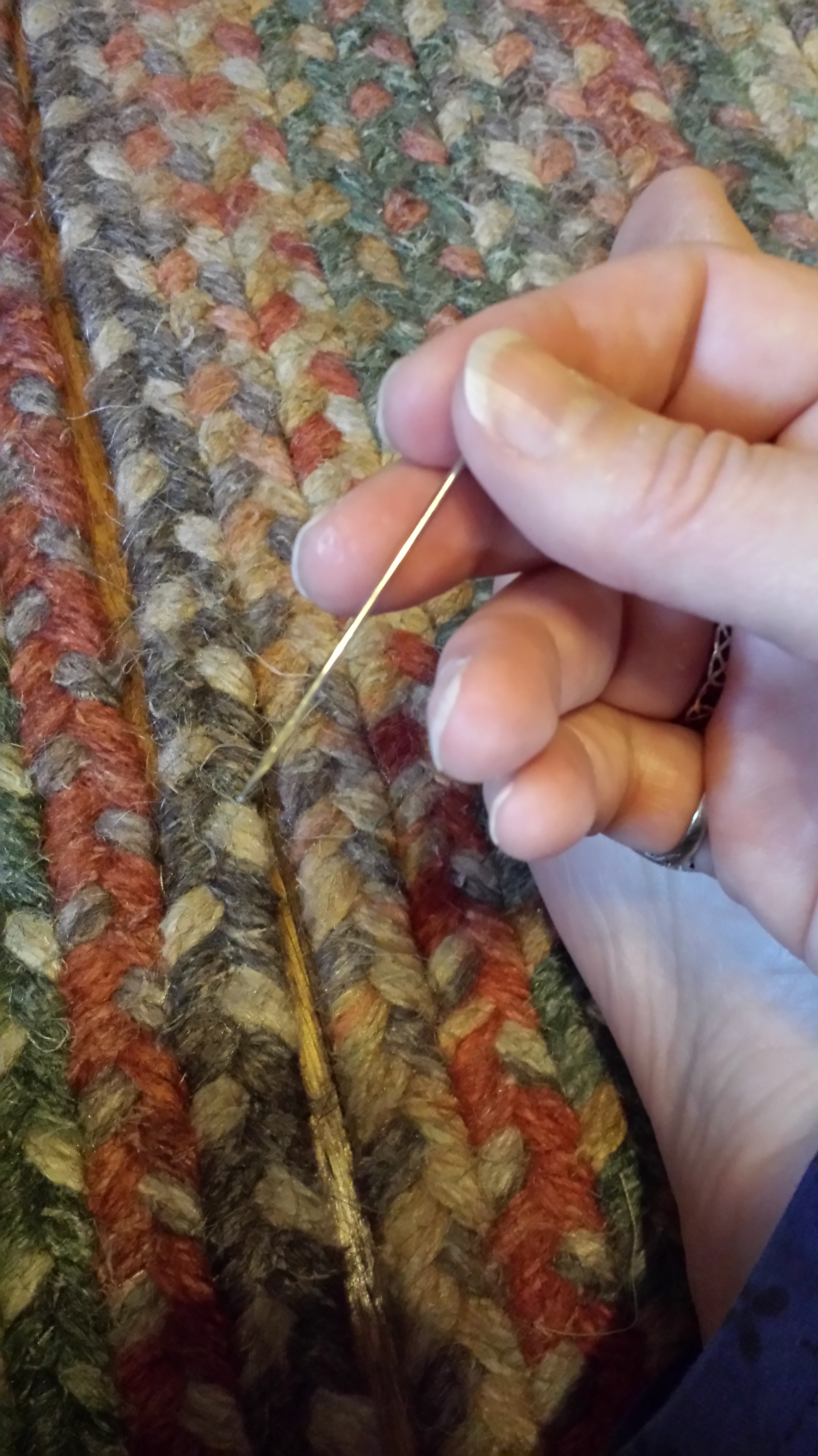 Repairing a huge braided wool rug that we bought for only ten bucks at a church rummage sale a few years ago. The only catch was it was coming apart at the seams. At the time I thought I’d repair it after I recovered from my hand surgery. Better late than never. It was one of the best deals I ever found. It was absolutely clean so I suspect that it started coming apart after they cleaned it and whoever it was decided to sell it cheap rather than repair it. I did a little research and this rug would retail around $900 on the low end.