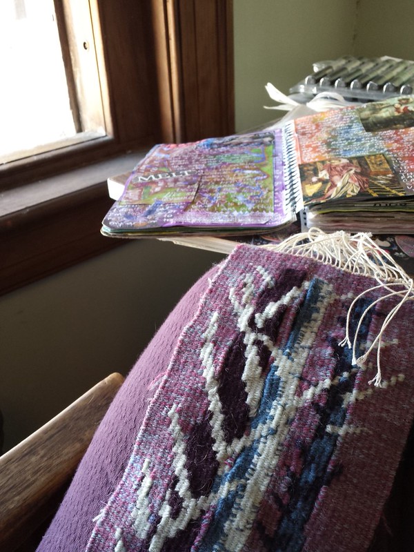 I’ve caught up on the part of Cathedral that I unwove back in January. I have it to work on at home and I go to my studio at the church to work on other projects or just journal and relax, mostly on Sundays. It is a little bit creepy being there alone at night so if I go during the week, I try to leave before it gets too dark. Yesterday I finished hemming and backing the two small Sitka pine tapestries from last year, and I’m thinking about making them book covers.
