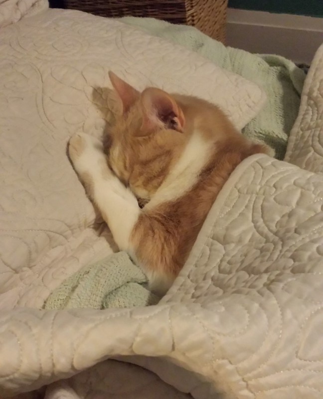 It’s hard to believe that Diego and Pablocito have grown into such big adults. Especially Diego, who I sometimes call “Bruiser” now, because he is not very nice to the other cats. He and Pablocito still play, but you can tell that Pablocito is wary of him. Theo despises him, for good reason, and will hiss at him if he prances up to him. Diego is a buttkicker and a bully, and he likes to cuddle up to me. He has managed to get the bedroom door open two nights recently by pawing at the doorknob and pushing on the door. I don’t think that this is a good development. I love my bad boy, though.