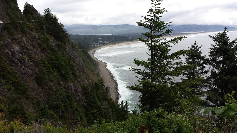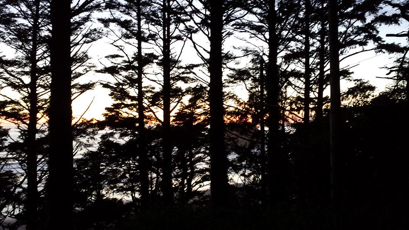We saw our friends off on Sunday and Monday and Pam was kind enough to let us stay another night at her cabin while we figured out what we wanted to do next. Our only plan was to return to Portland on Thursday night, when our car rental was over. I wanted at least one more day on the coast. We cleaned and did laundry at the Livermore House and headed south to Manzanita to have lunch at the Big Wave Cafe on Hwy 101. I needed some fried halibut before I left the coast. We drove a bit further south and poked around a few shops in the little town of Nehalem, then went back to Pam’s cabin, said goodbye to her, and caught the sunset over the ocean one last time. I finished weaving my sample, although later I went back and unwove part of it and altered it.