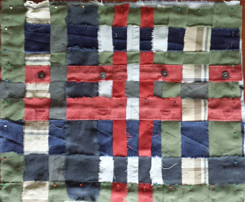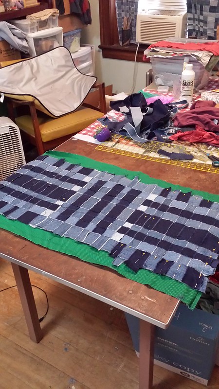 The next (final?) denim panel woven in a log cabin “color and weave” pattern, and a portable cloth weaving project with Sandy’s old shirts to be sewn into a lightweight blanket later. I was not able to stay out of the church studio so the AC went back on and I was much happier. Even cutting up and ironing the old shirts gives me satisfaction, and I do not even iron my own clothes. I think that I might have enough of the denim panels to sew the denim blanket, but will wait on that until the temperatures drop.