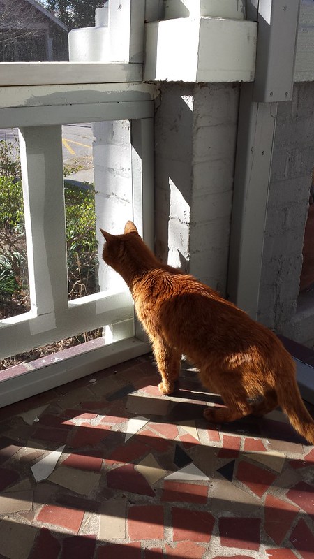 The cats are loving the front porch. Miss Penny from across the street most definitely does NOT approve. She considers all the porches on this street her territory, and it was bad enough that we blocked her access by screening it, but now there are TOMCATS on it. She stalks around growling, howling, yowling, and attacking the screen. Diego, the alpha cat, is terrified of her. Pablocito, my puppy cat, is curious but staying the hell away.
