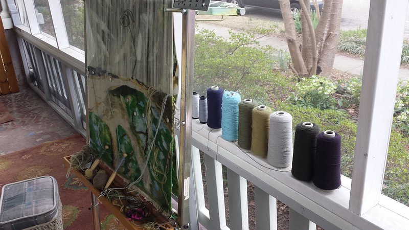 The weather was beautiful week before last and I moved the Shannock loom out to the front porch for one day. Looking forward to weaving on the porch more often now that I have it screened with a ceiling fan and electricity. Susanne, Marianne, and I enjoyed the porch at the studio house too.