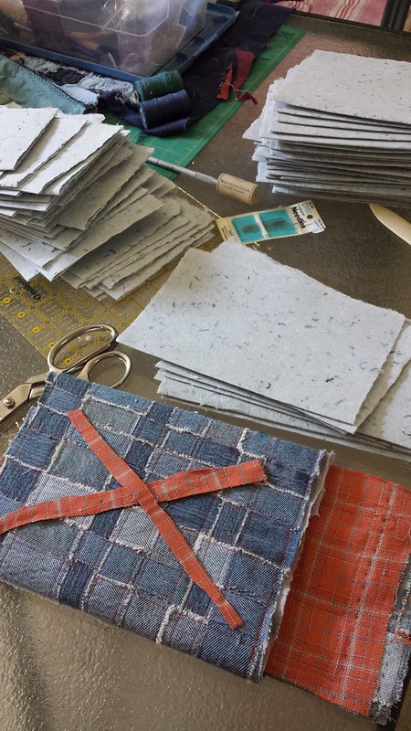 It was the first book I have made in many moons. I didn’t have a real plan. My sewing machine was in the shop and so I got out the denim paper that I made last spring and a piece of the recycled denim woven cloth to make a cover. A couple of scraps of old pajama pants decorate the front. This one is for me to experiment with stitching on paper. The paper is very soft so if I make another book with it I will need to reinforce the signatures where the pages are folded and stitched to the cover.