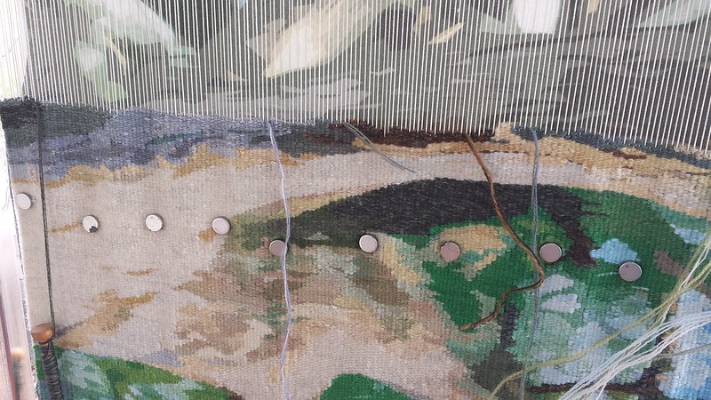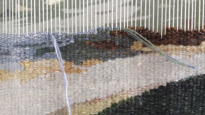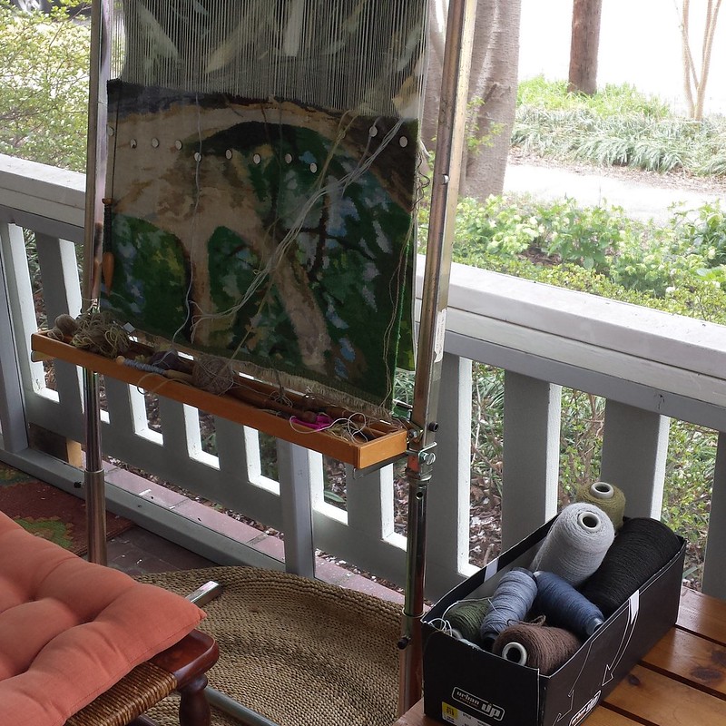 Tapestry weaving on the front porch yesterday. I actually got a bit farther than this. When I go back home this afternoon, I hope to finish the blue grey part, but that also depends on working the dark part, and that might build on top of the right side, so that’s how it goes!