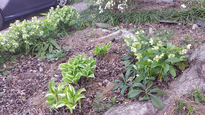 I want to get more bright colors in there, but the shadiness lends itself better to Lenten roses and hostas. I’ll plant some foxgloves and more purply foliage such as coral bells. The bloodroot I transplanted last year really took off and that was very pleasing. The Solomon’s seal is probably my favorite plant and has expanded a lot since I planted it near where the gutter empties rain from the roof several years ago.