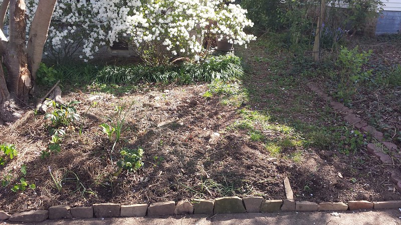 My focus has been the front yard, although I did plant sugar snap peas, Oregon giant snow peas, Nantes carrots, and arugula in the back forty. Now that I get a little more sun on the south side of the front yard, I’m going to take advantage of it before the neighbs let their yard grow into a jungle again. I do miss their butterfly bush, though.