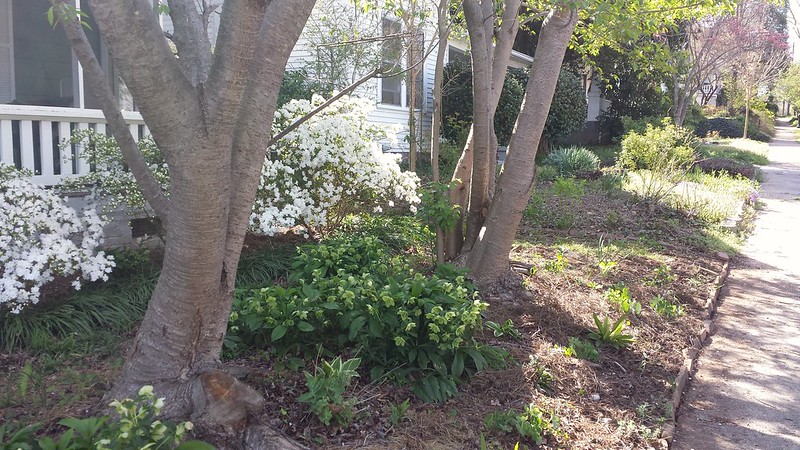 Moving herbs to the south side because they are being taken over by Lenten roses. I also moved some flower bulbs (don’t know the name, will find out) and weeded a lot of the hated liriope and wild onions and ivy and other invaders. One day if I am not broke from traveling and house remodeling I’m going to hire somebody to dig out all the liriope and English ivy. The last person I asked for an estimate for cleaning out the English ivy and other vines in the back forty was the guy I hired to cut the little bit of grass and weeds we had back when neither Sandy or I could do it. He looked at it in horror, backed away without giving me a price, and I never saw him again.