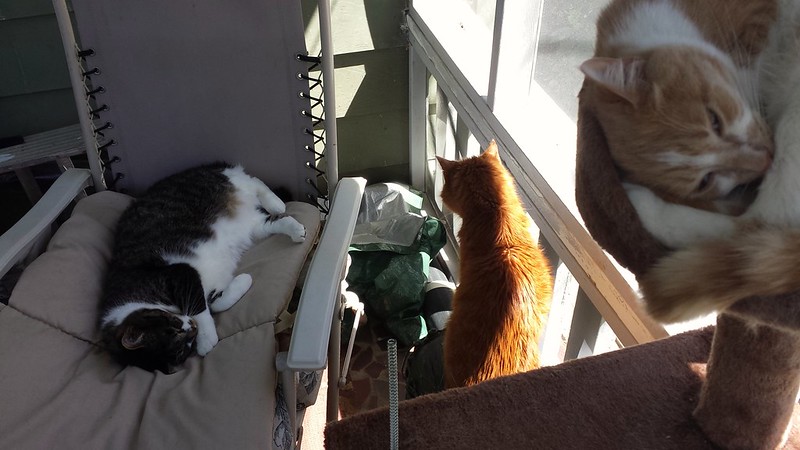 In the studio: not much. A little random sewing of scraps. I’m going back home today and weave on my tapestry on the front porch. The cats are loving it. Sandy moved Pablocito’s cat tree out there. We both spend hours reading together. This screened porch is a good addition to our lives.