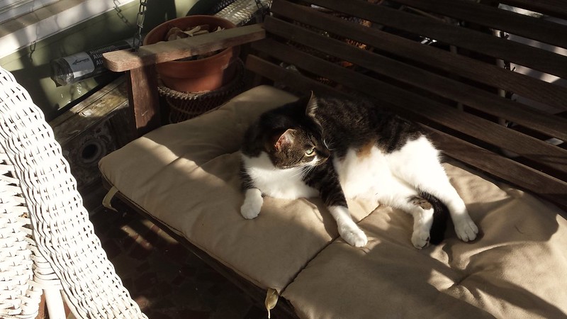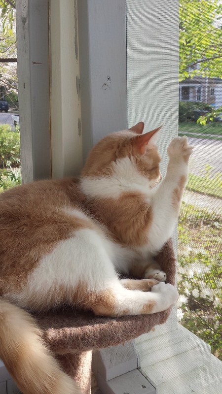 The cats are in love with the front porch, but it is aggravating Theo’s allergies, so I may have to limit his time out there or take him to the vet for another shot. Right now I give him loratidine every night. His new name shall be “Snufflebutt.” Diego is “Chunkybutt.” Pablocito is “Wigglebutt.”