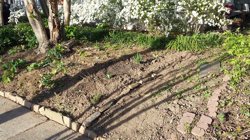 I’m almost finished with planting and weeding and fixing the border on the front yard garden. The south side will be sunny for a few more weeks, at least. I hope it will be sunny longer. I planted a globe artichoke, borage, Salem rosemary, foxgloves, French thyme, spearmint (in a place where I don’t mind it spreading), more hellebore seedlings that I got from my neighbors (these have purplish flowers). They may not make it but they have plenty more. I bought orange thyme and lemon thyme plants from Deep Roots today.