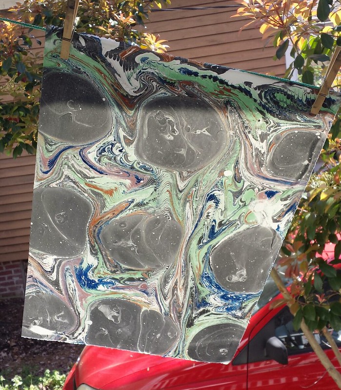 A couple of weeks ago, Susanne was marbling paper and I marbled a couple of pieces. I’d like to try marbling on fabric.