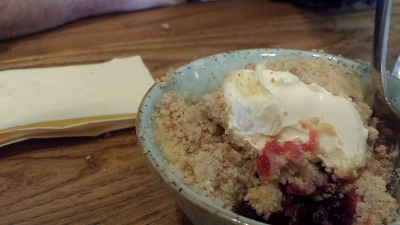 Dinner was at the Grove, where you ordered food at the bar and took a spoon with a number on it for your table. They found us upstairs, where Sandy had the beef stroganoff special and I think this is where I had salmon. Dessert was Cold Apple and Rhubarb Amaretti Crumble, Custard with Clotted Cream. Clotted cream is one of the regional foods around here, somewhat like cream cheese. We sat on the balcony for a while and watched the seagulls.