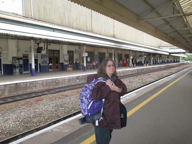 On Friday, we ate one last breakfast at Charlotte Guest House, loaded our packs, and took the Tube to Paddington Station, where we got on a train to Exeter. I wish I had taken a photo of the train station at Paddington, because it was different than others I’ve seen, but we got on the train so quickly that I didn’t get a chance. Here’s a tip – if you travel by train in England, the cheapest fares during the day are mid-day.