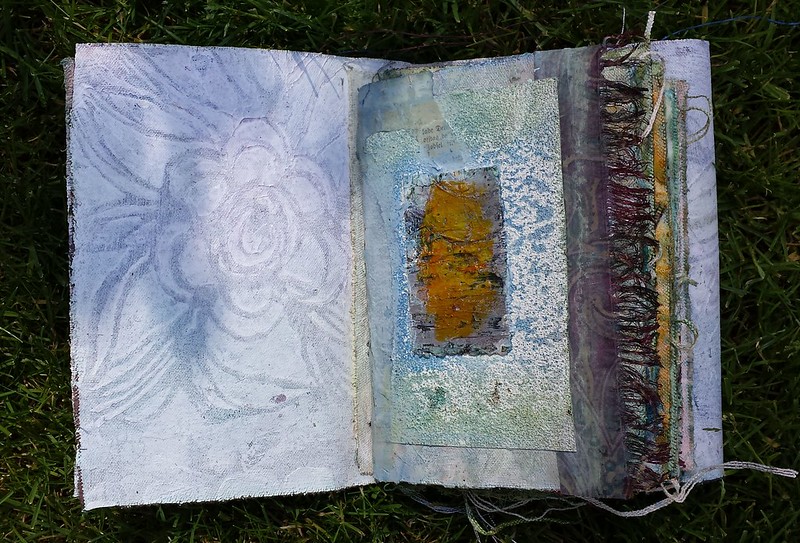 For this one we brought a large piece of heavy gessoed canvas, then used gesso to stencil and stamp all over it for texture. After brushing on a base layer of paint or ink wash, we tore the canvas into pages for the book and played with Leighanna’s assortment of acrylic mediums and Venetian plaster. We glued down cloth and paper and other stuff, laid the pages out in the hot sun to dry, and kept on layering and painting the pages until we ran out of time (see top photo). Then we did a simple longstitch binding (thank God for my Japanese screw punch – those pages were thick). The next step for me will be attaching more stuff to the cover and spine. I brought some of my metal deck cards from the 2010 class and one of them just happened to be perfect for the cover. I’m eager to work in this book some more but have had some challenges getting back to it yet.