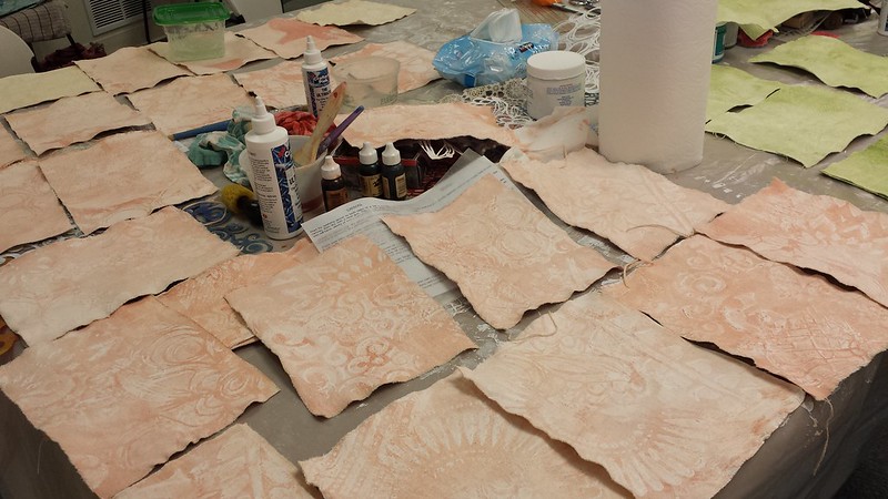 This year, Susanne, Judy, and I took a class in beginning embossing from Janice Fisher on the first day. I couldn’t get any good photos – embossing is hard to photograph, and when I’m into what I’m doing, I don’t remember my camera. I did better later. My main takeaway from the class was that embossing paper is so much simpler and easier than I ever guessed, and you can do it on almost any kind of paper with as little as a stencil cut out of an old manila file folder and a popsicle stick. Janice was very into recycling and repurposing ordinary objects for embossing.