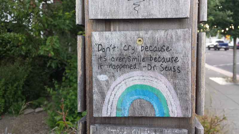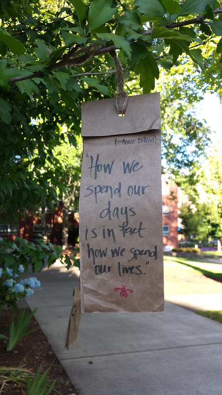 Forest Grove has a community edible garden program. Plots with veggies and berries had signs that invited you to help yourself. One was in front of Forest Grove Community School, which also had lovely flowers and artwork.