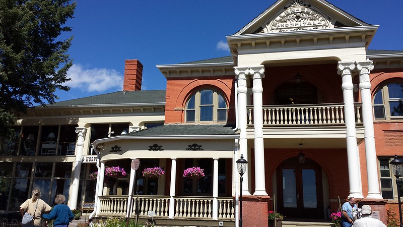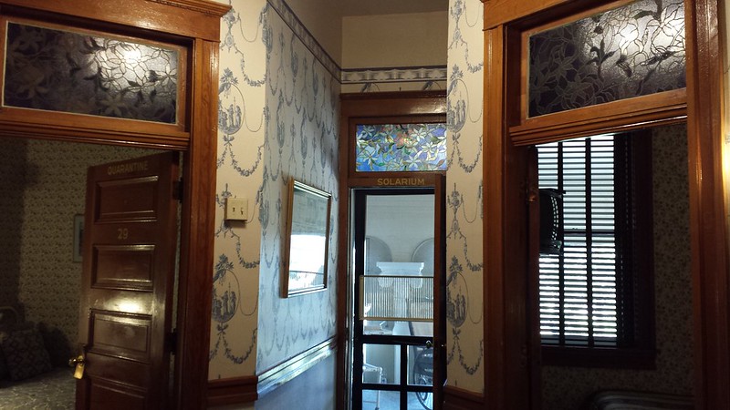 Once we got there we checked into Cripple Creek Hospitality House, which turned out not only to be inexpensive and historic but fascinating and beautifully decorated as well. It was the former Teller County Hospital, built in 1901. All the rooms had names of the former use of the room. For example, the room on the left in the photo below had “Quarantine” on the door. Guess I’m glad I didn’t have that room!