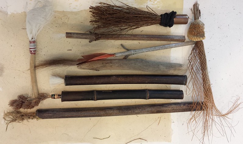 I had a good weekend. On Saturday morning I drove to Chapel Hill and played with the Triangle Book Arts group. We spent the first few hours making brushes with bamboo and driftwood and deer tail and horsehair and feathers and various plant materials, then the last two we spent making marks with things such as small pieces of wood and bleach on black paper, and using salt on wet pigments and spraying through made stencils and such. When I got home Sandy and I went to the Deep Roots Grand Reopening. A fun day.