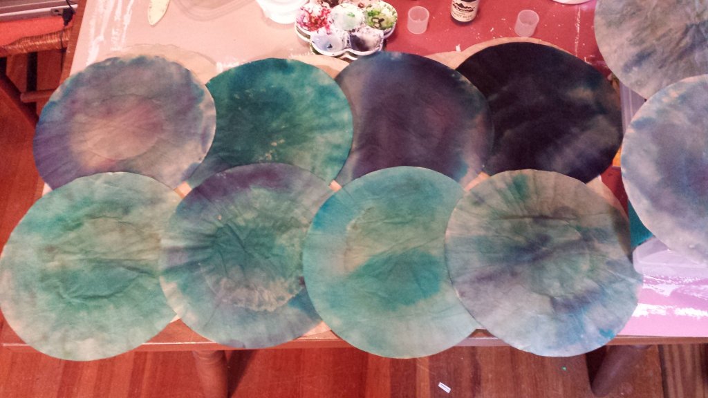 Anyway, I am working on an accordion style book that is supposed to hang on display in the Triangle Book Arts group show in 2018. The book’s theme is “FLOW” which is turning out to be rich creative ground for me, almost too much. As I started thinking about the back side of the pages and the connectors, these coffee filters came to mind. I knew that they took markers well so I decided to do ink washes on them.