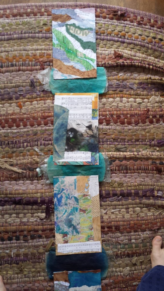 I finished the insides of the panels for the Flow book today. Tomorrow I will finish the back sides, which will be much simpler. I messed around with laying them on the floor and switching them around to make them “flow” better. I can already see what I will change in the process for the next book, but I’m going to finish this one and send it off.