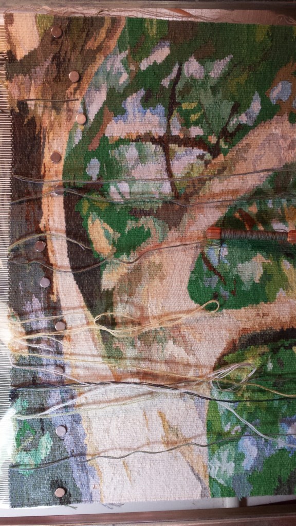 Yay! I am weaving again. I’ve gotten a bit more done than the photo above shows, but I didn’t get a clear shot of the most recent version. I am weaving this sideways, so I flipped this photo so that you can see it as it will look when hung. I’m a little over halfway through.