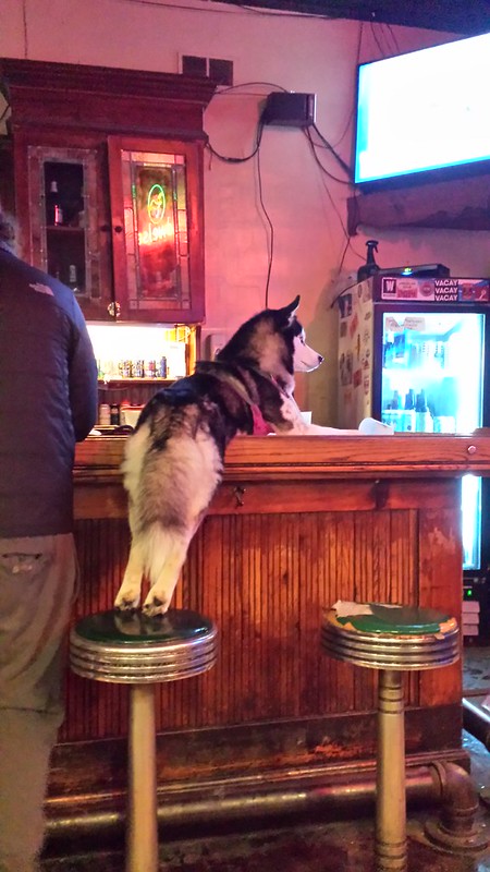 After he got off work at 5 yesterday, we shuffled down the street to the corner bar where we seldom go anymore. It filled up with 20-somethings after I took this shot. I love bar dogs. We used to take Janet Planet to bars with us.
