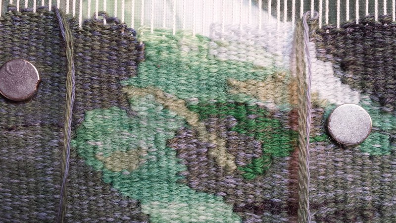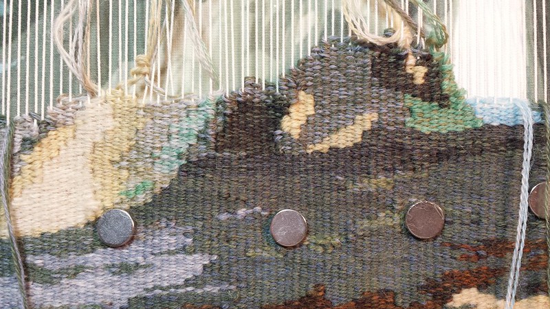 Hi Debbie! I’ve been convinced to send the one on the left by the feedback of the weavers on the small format tapestry Facebook group, and I’ll eventually weave the other as a larger work. The rare earth magnets are terrific for holding the cartoon to the back of the tapestry, but man, are they strong! They are also brittle, believe it or not. Anyway, I got the idea from Janette Meetze, and they are about the size of a dime. I wouldn’t recommend anything larger and smaller might be too hard to pull apart. Also, if you weave with sacking needles or stitch slits as you go, as I sometimes do, they wouldn’t be a good choice because they catch the needles and magnetize them.