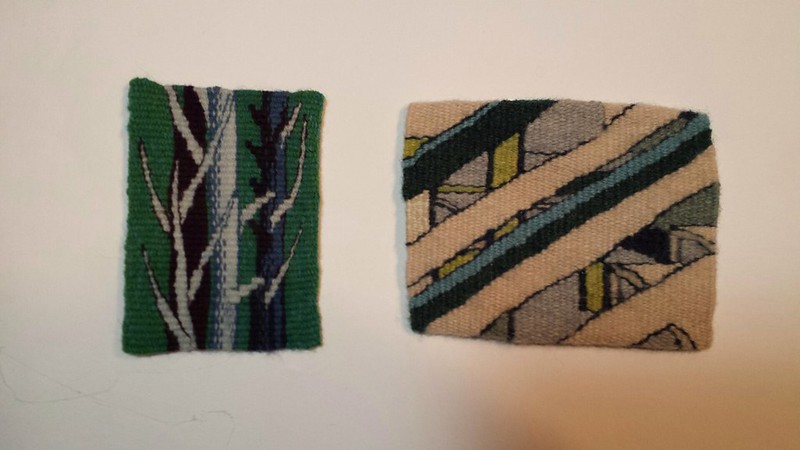I posted this photo for feedback on which tiny tapestry to send to the American Tapestry Alliance’s unjuried “Biggest Little Tapestries in the World!” exhibit planned for Convergence in Reno, Nevada this July. I’ve been convinced to submit the one on the left, which I wove during one of Pam Patrie’s workshops with Archie Brennan and Susan Maffei from a drawing I did of the pines on the seacliffs there.