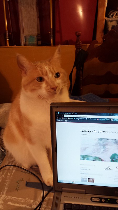 Pablocito is the new spokescat for Slowly She Turned. He carries on a long feline tradition that passed from Miss Jazz (of Jazzcat Productions, the website of the 90s), Squirt, and Theo. Welcome to the staff, Pablocito O’Neill! Right now Pablocito is guarding the back of the laptop and purring loudly.
