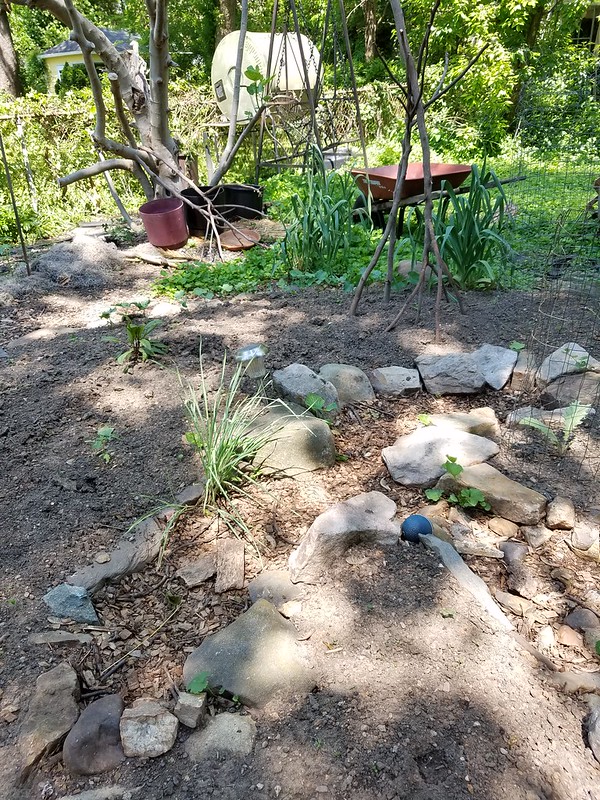 I’ve been working hard this week to get the garden planted. Now I have the area along the fence to plant, and Sandy and I have decided to use the greenhouse frame as a support to grow trombincino squash on. I took off the greenhouse cover and pulled up the landscape fabric yesterday. My only concern is that this area doesn’t get enough sun now that the trees have leafed out, but I’m going to try it anyway. I used to plant in this area back when the entire Back Forty was in food production. In the meantime, I’m going to put down cardboard and landscape fabric in another sunnier area to prepare for moving the greenhouse later this year.
